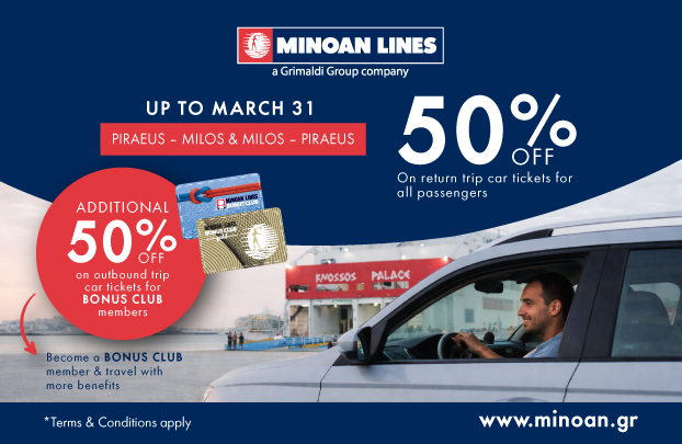 Für alle Mitglieder des Minoan Lines Bonus Club wird auf der Strecke Piräus – Milos – Piräus ein Rabatt von 50 % auf PKW-Tickets für Reisen bis zum 31.03.2026 angeboten.