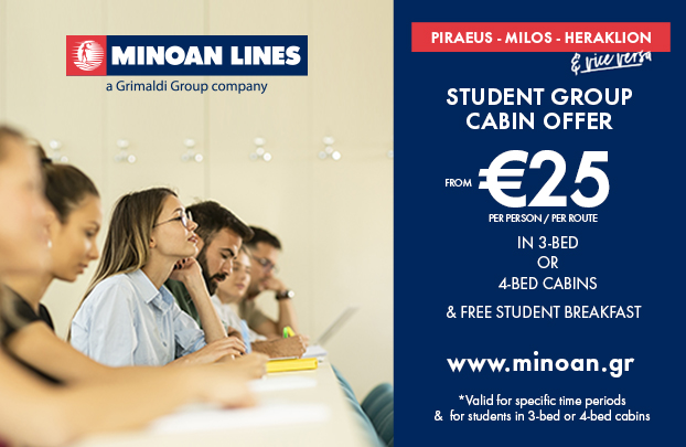 Special offer for student groups traveling in a cabin on the route Piraeus–Milos–Heraklion or Heraklion–Milos–Piraeus: