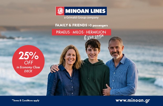 The 25% family and friends offer on the Piraeus-Milos–Heraklion or Heraklion-Milos–Piraeus route is valid for trips from 10/02/2026 to 31/03/2026.