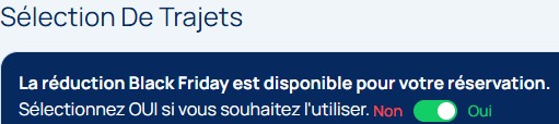 L’offre s’applique en sélectionnant OUI à l’étape « Sélection De Trajets » dans le système de réservation en ligne, comme indiqué dans l’image ci-dessous.