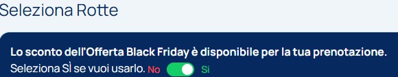 L’offerta viene applicata selezionando SÌ al passaggio “Seleziona Rotte” nel sistema di prenotazione online, come mostrato nell’immagine seguente.