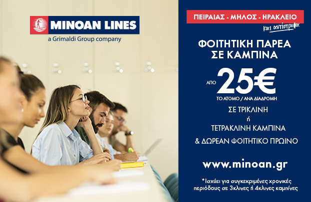 Για παρέες φοιτητών που θα ταξιδέψουν σε καμπίνα στη γραμμή Πειραιάς-Μήλος-Ηράκλειο ή Ηράκλειο-Μήλος-Πειραιάς, ισχύουν οι εξής προσφορές: