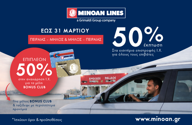 Προσφέρεται 50% έκπτωση στο εισιτήριο των ΙΧ οχημάτων για όλα τα μέλη του MINOAN LINES BONUS CLUB στη γραμμή Πειραιάς-Μήλος-Πειραιάς για ταξίδια μέχρι και 31/03/2026.